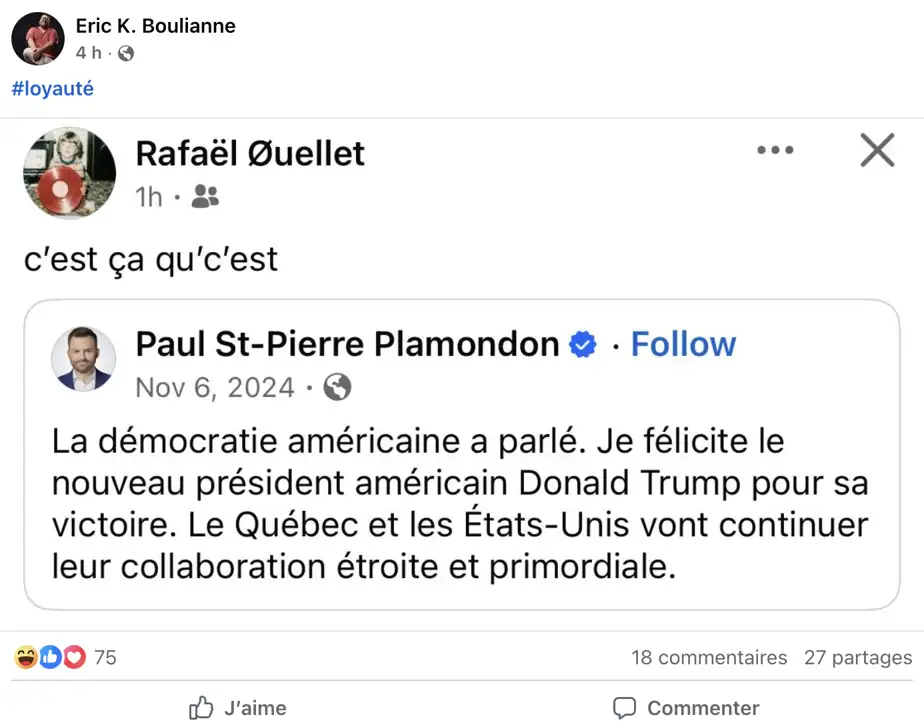 Ceci étant dit, le constat factuel sur le régime fédéral qui affaiblit le français se mêle à une accusation de "manque de loyauté" du milieu culturel québécois, qui est révélatrice d'une stratégie communicationnelle de PSPP qui mobilise à outrance ce registre moral dans ces prises de parole dans les derniers mois. La dualité loyauté/trahison n'est pas anecdotique, mais une caractéristique centrale du discours de la droite identitaire qui l'utilise de façon délibérée dans plusieurs prises de position. C'est pourquoi j'ai mentionné cette idée dans ma dernière publication Facebook: