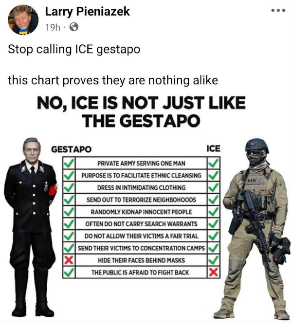 Quatrièmement, il y a la stratégie du parallélisme absolu: pour être qualifié de "fasciste", un régime politique contemporain devrait reproduire à l'identique le régime de Hitler ou de Mussolini dans les années 1920-1930, point par point. Chaque petite différence sert de prétexte pour dire: "haha voilà, vous voyez, on ne vit pas exactement la même chose aujourd'hui, et donc ce n'est pas du fascisme". Voici un exemple de cette stratégie illustrée par cette image satirique trouvée en ligne qui compare les agents anti-immigration ICE avec la Gestapo du régime nazi.