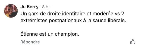 C'est sans doute la première fois où j'ai eu la chance de débattre de façon franche mais apaisée avec un adversaire se revendiquant du nationalisme conservateur, proche de Mathieu Bock-Côté, mais avec un style plus modéré et sympathique. Comme je l'ai indiqué dans un statut Facebook: