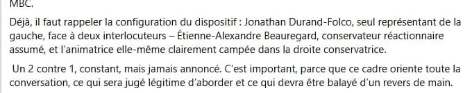 Ces deux commentaires d'individus lambda montrent qu'on a bien réussi un croisement des chambres d'écho: d'un côté, je suis dépeint comme un "extrémiste postnational à la sauce libérale" avec l'animatrice qui serait de mon bord, alors que de l'autre je serais le seul représentant de la gauche face à deux conservateurs crinqués. Pour ma part, je crois aussi que Virginie est davantage près de la nébuleuse néoconservatrice, mais j'ai accepté de participer à sa balado en écoutant quelques épisodes où j'ai apprécié son ton, le format des émissions et le souhait de croiser les regards, en invitant des figures comme Émilise Lessard-Therrien, Mathieu Bélisle, Julie Miville-Dechêne, etc.